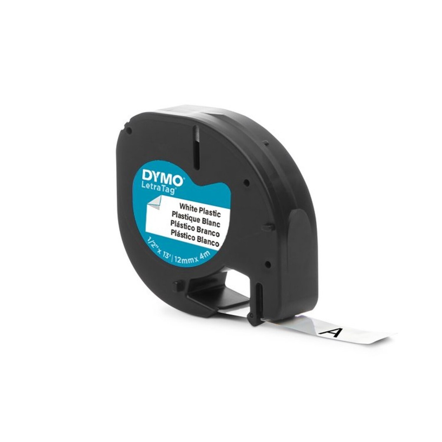 Cinta Dymo Letratag en plástico, impresión en negro sobre blanco de 12mm ancho*4mts longitud. Blíster por 1 rollo, despegue fácil del reverso.