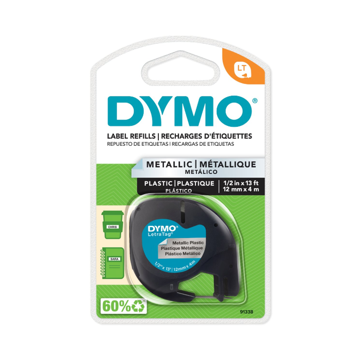 Cinta Dymo Letratag en plástico, impresión en negro sobre plateado de 12mm ancho*4mts longitud. Blíster por 1 rollo, despegue fácil del reverso.