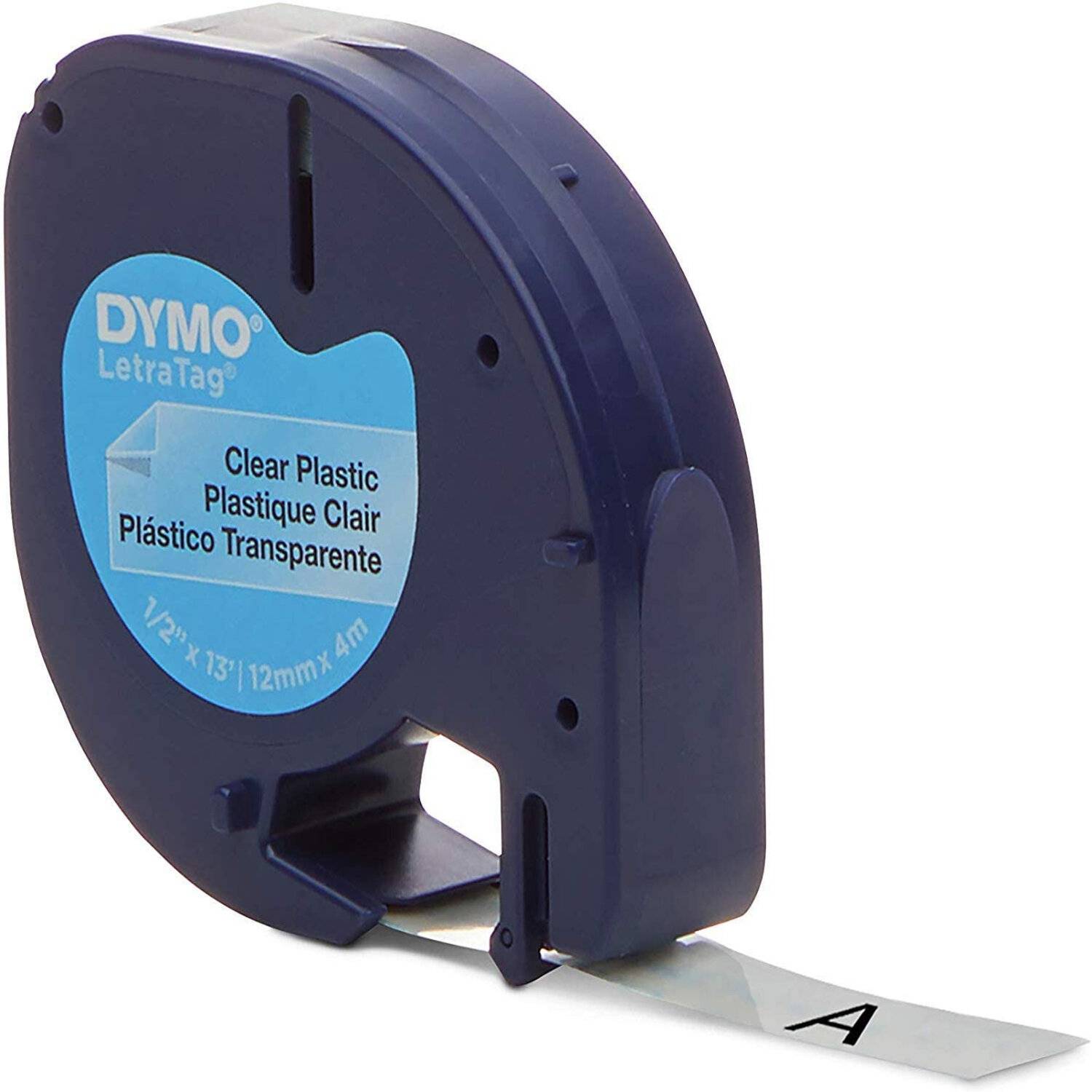 Cinta Dymo Letratag en plástico, impresión en negro sobre transparente de 12mm ancho*4mts longitud. Blíster por 1 rollo, despegue fácil del reverso.