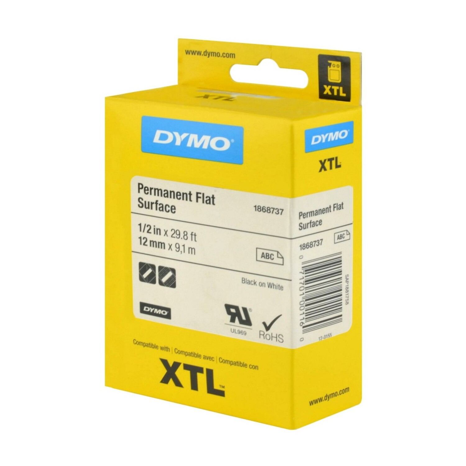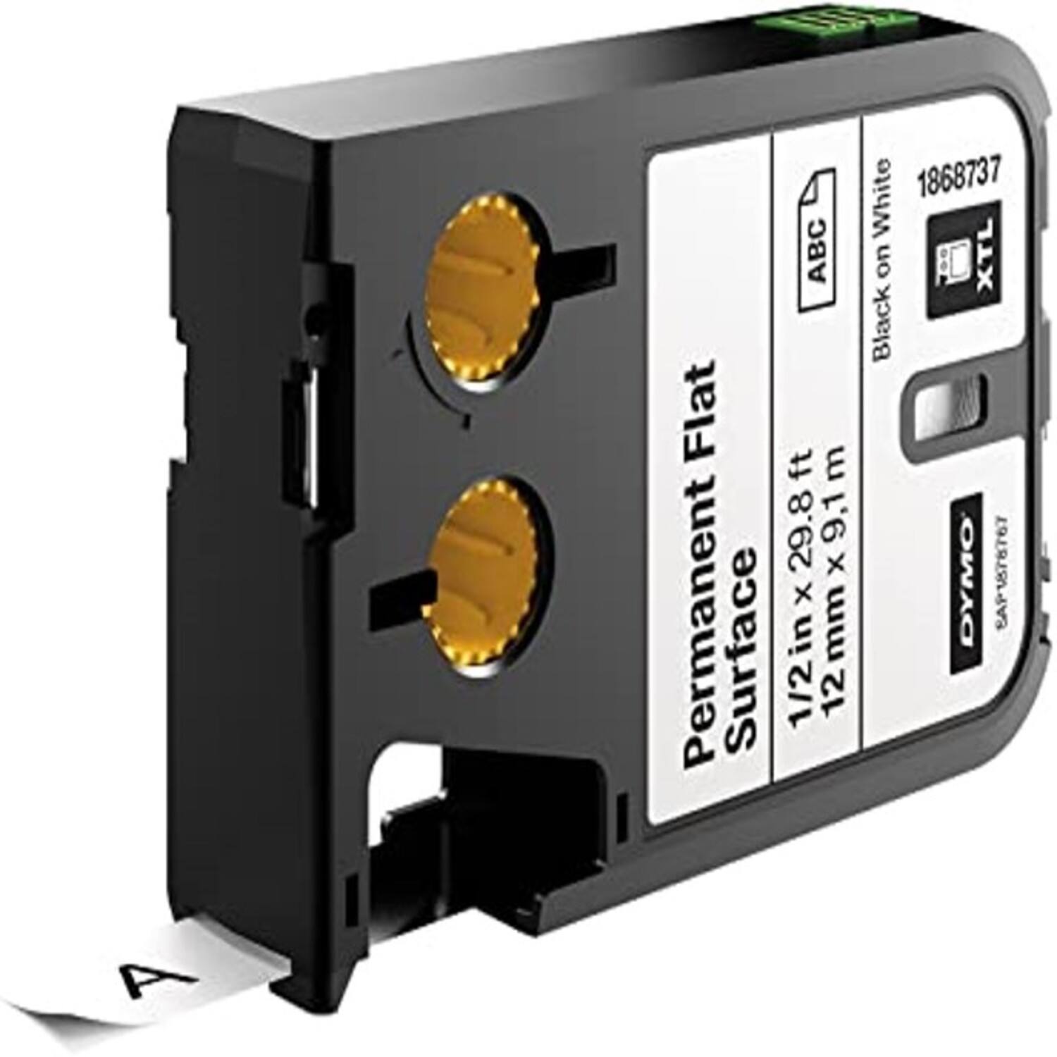 Cinta Dymo XTL en poliéster color negro sobre blanco de 12mm de ancho x 7 mts de largo recubierta con adhesivo de grado industrial.