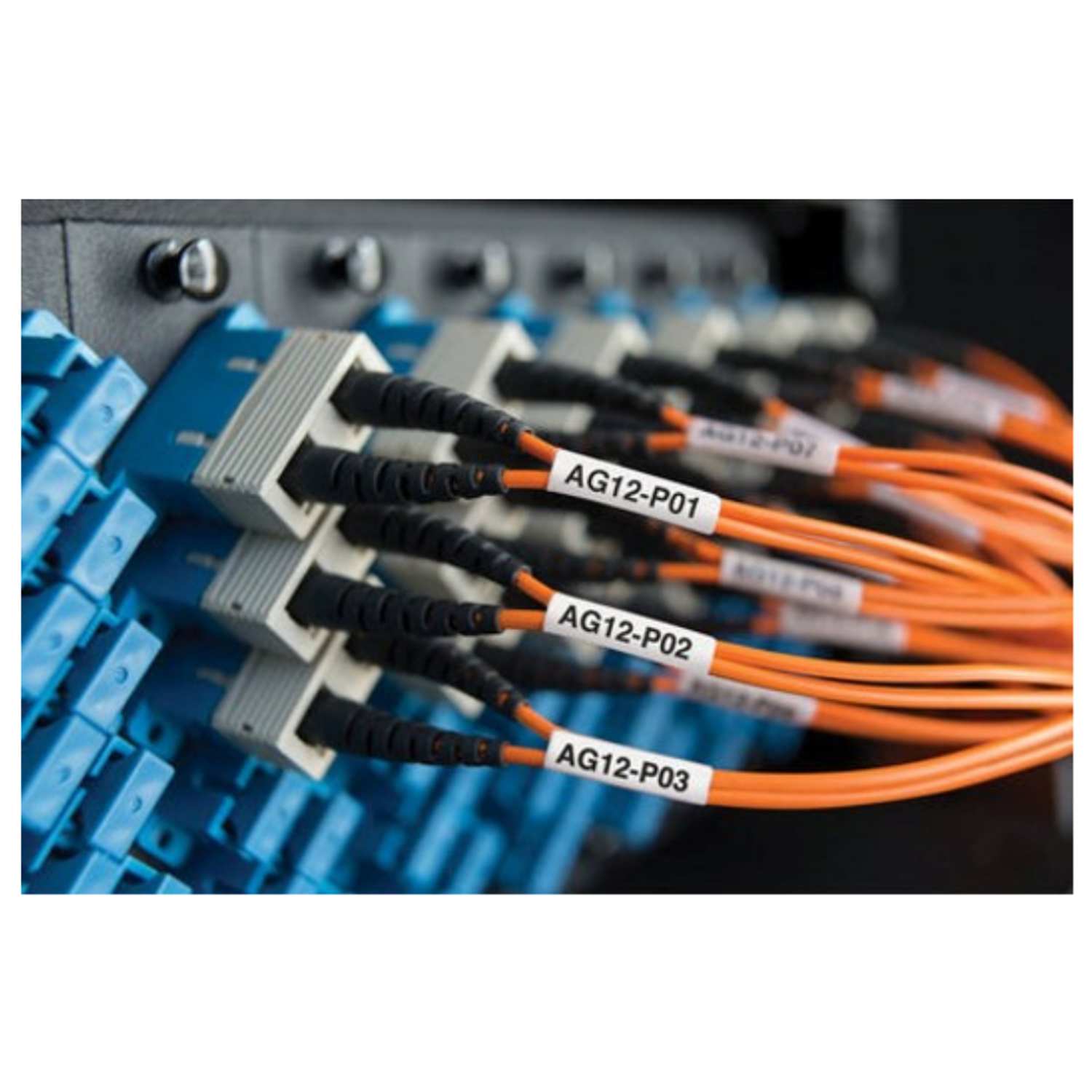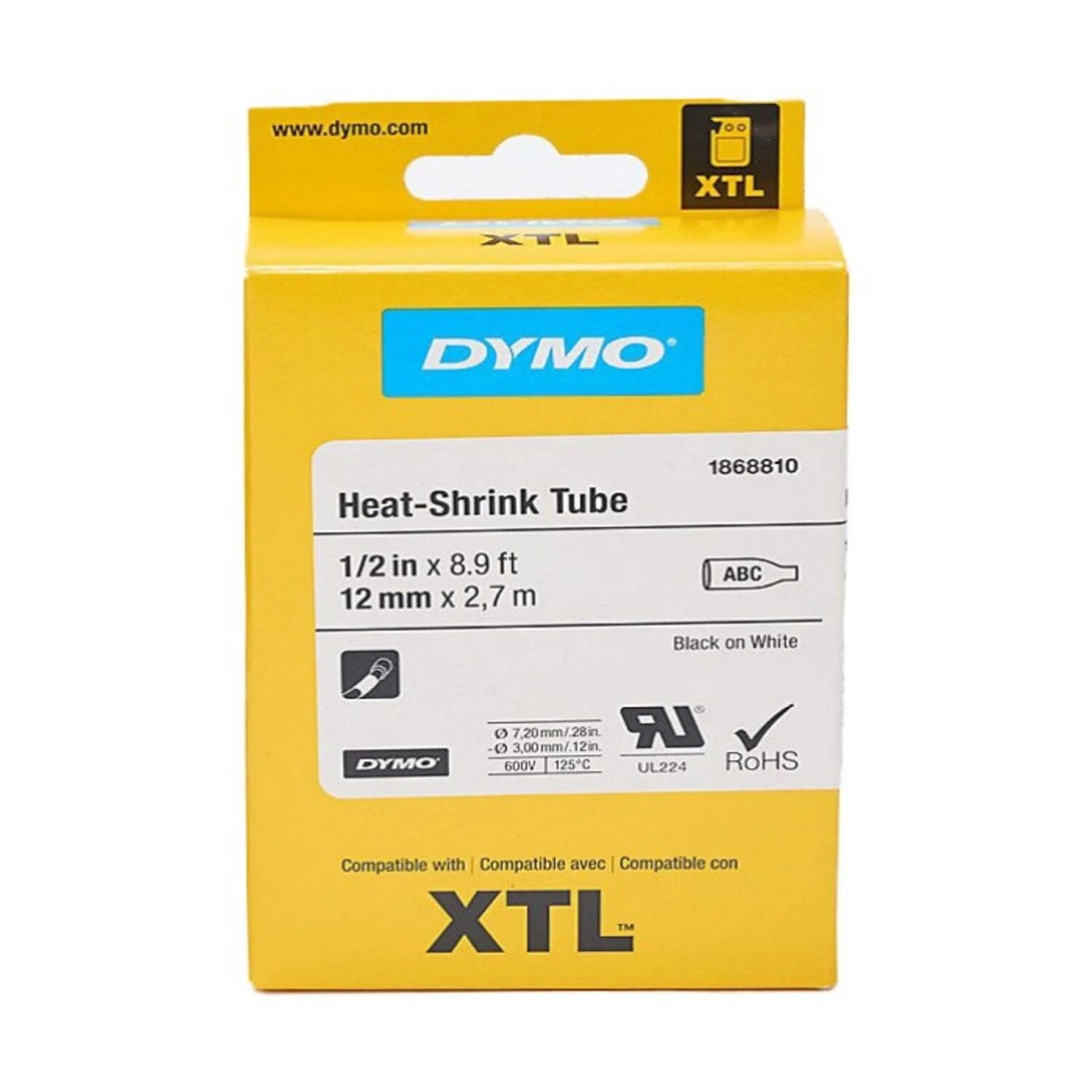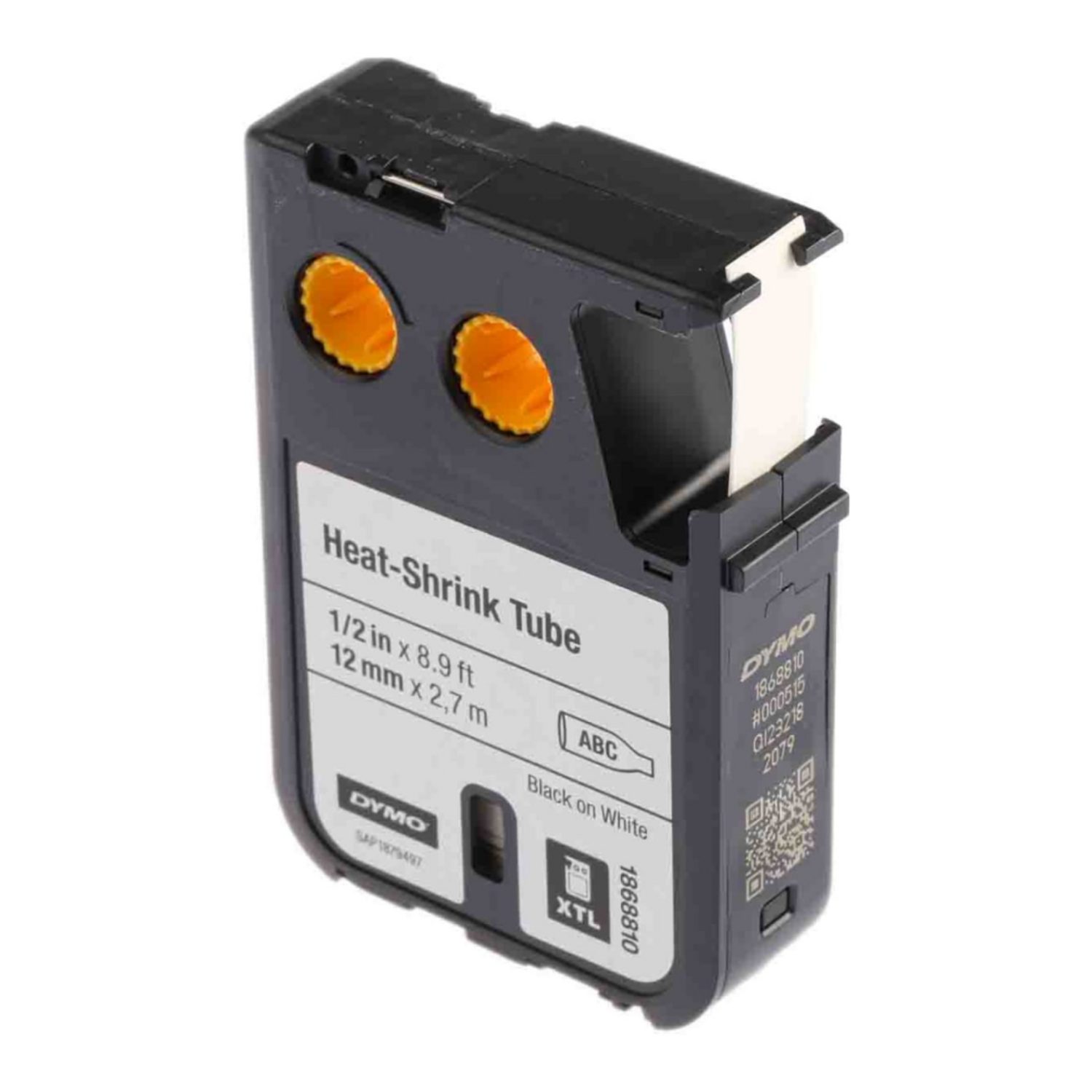Cinta Dymo XTL termoencogible de 12 mm, imprime en texto negro sobre fondo blanco con línea azul superior, los tubos termorretráctiles brindan aislamiento cuando se encogen y garantizan un ajuste seguro en cables y alambres con una relación de contracción de 3:1