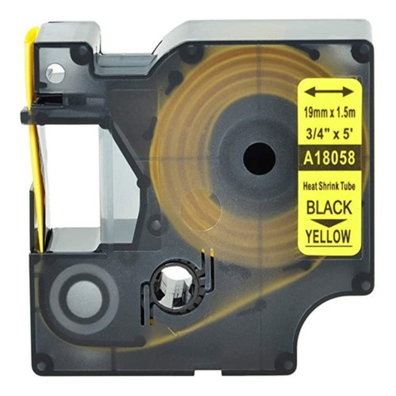 Cinta Rhino termoencogible para rotuladora Rhino 4200, 5200 y 6000 PLUS, imprime en color negro sobre fondo amarillo de 19 mm de ancho x 1.55 mts de largo
