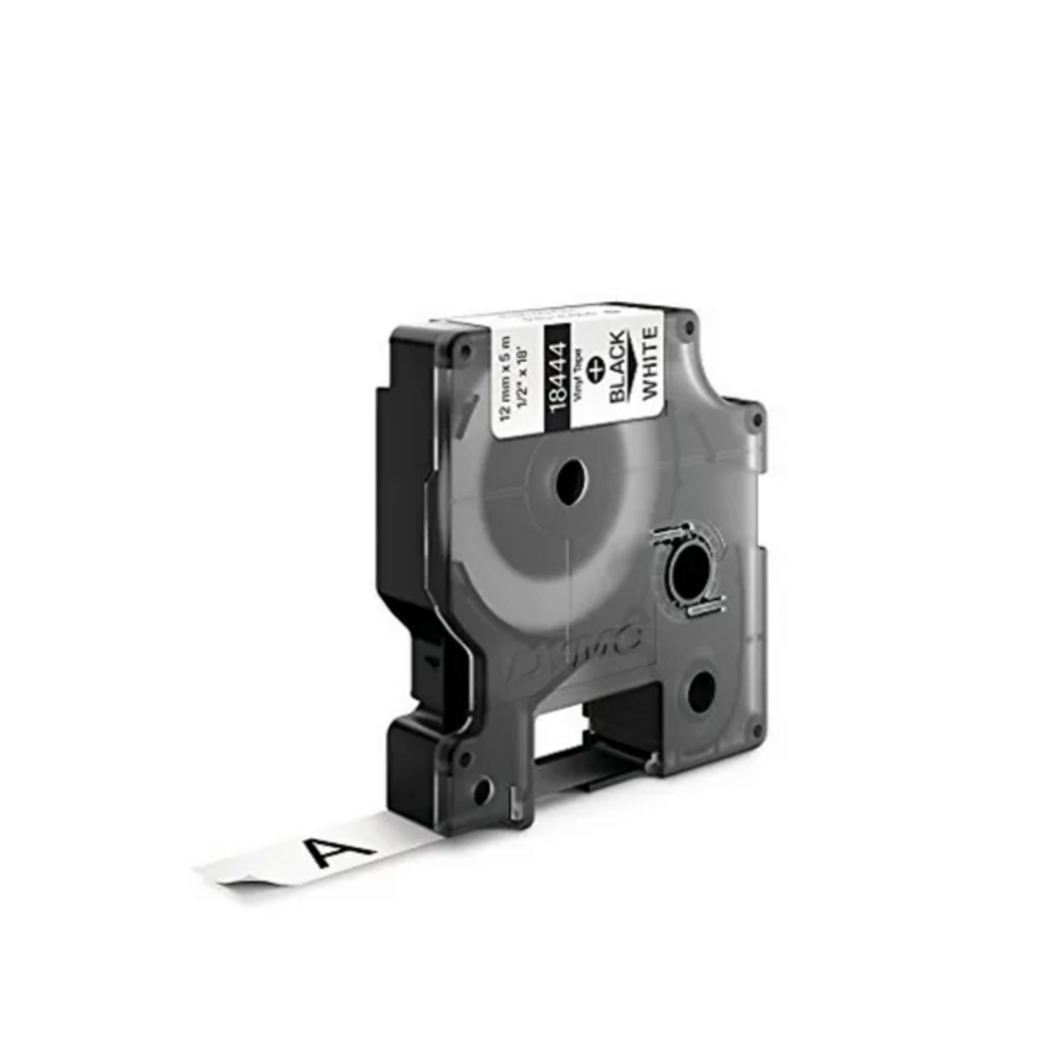 Cinta Rhino en vinilo para rotuladora Rhino 4200, 5200 y 6000 PLUS, imprime en color negro sobre fondo blanco de 12 mm de ancho x 5.55mts de largo