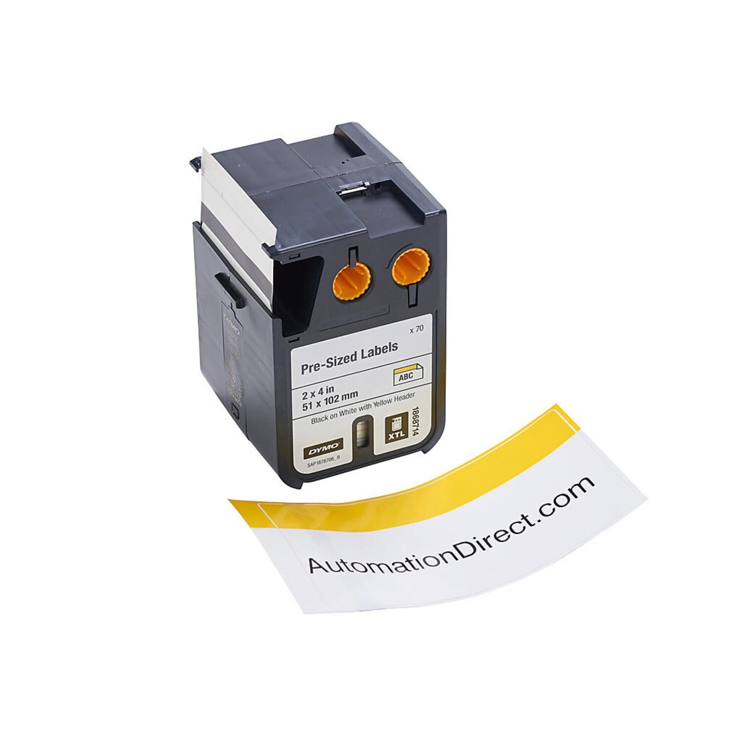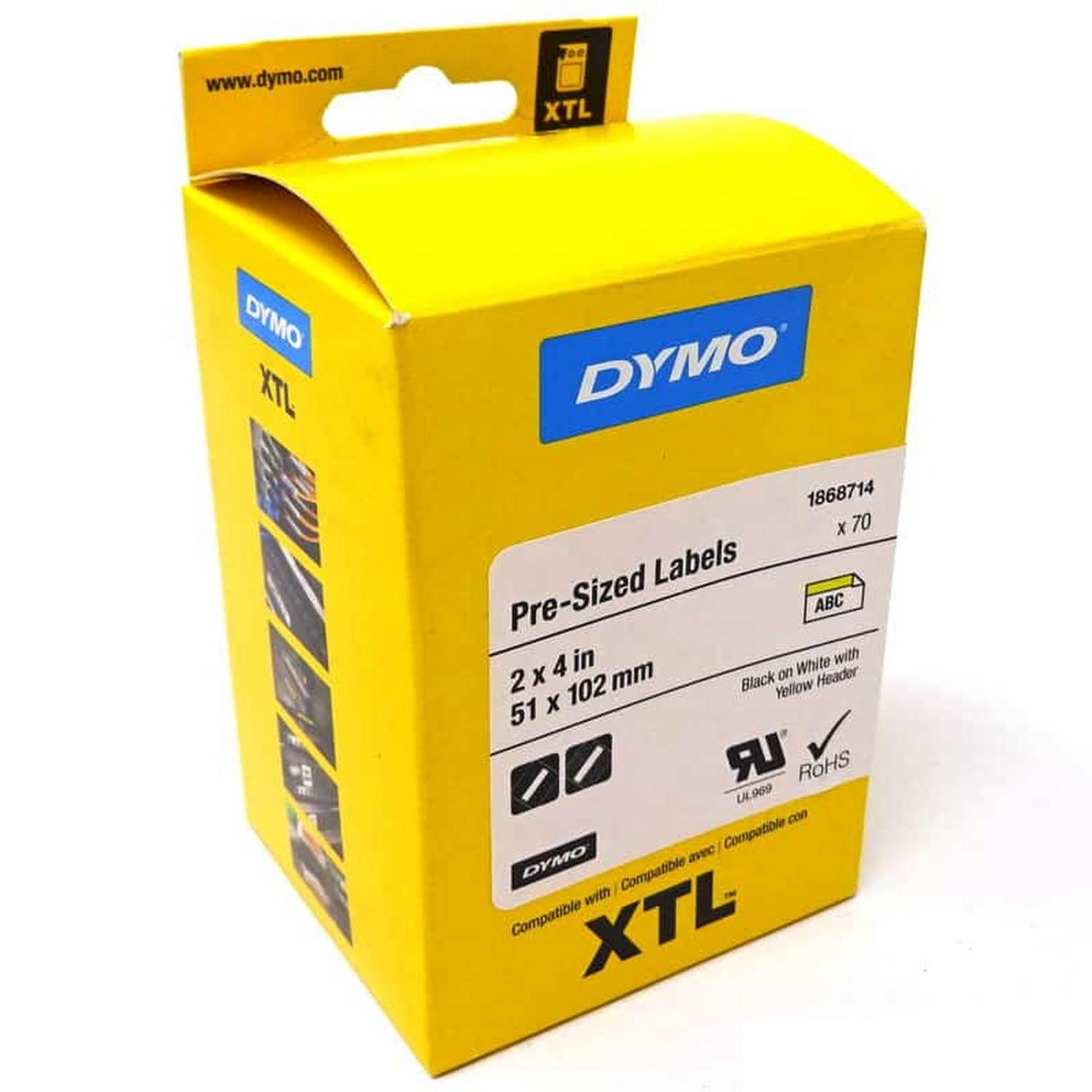 Cinta Dymo XTL precortada 51 x 102 mm imprime texto negro sobre fondo blanco con línea amarilla superior, los tubos termorretráctiles brindan aislamiento cuando se encogen y garantizan un ajuste seguro en cables y alambres con una relación de contracción de 3:1