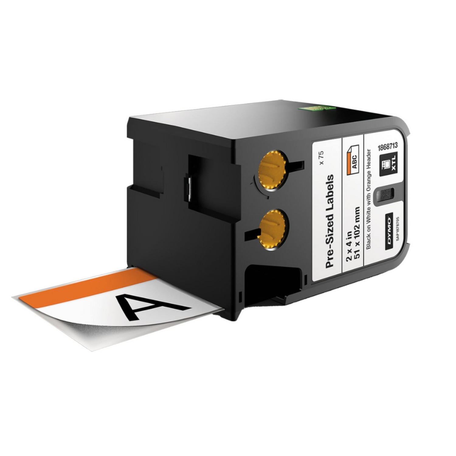 Cinta Dymo XTL precortada de 51 x 102 mm imprime en texto negro sobre fondo blanco con línea naranja superior, los tubos termorretráctiles brindan aislamiento cuando se encogen y garantizan un ajuste seguro en cables y alambres con una relación de contracción de 3:1