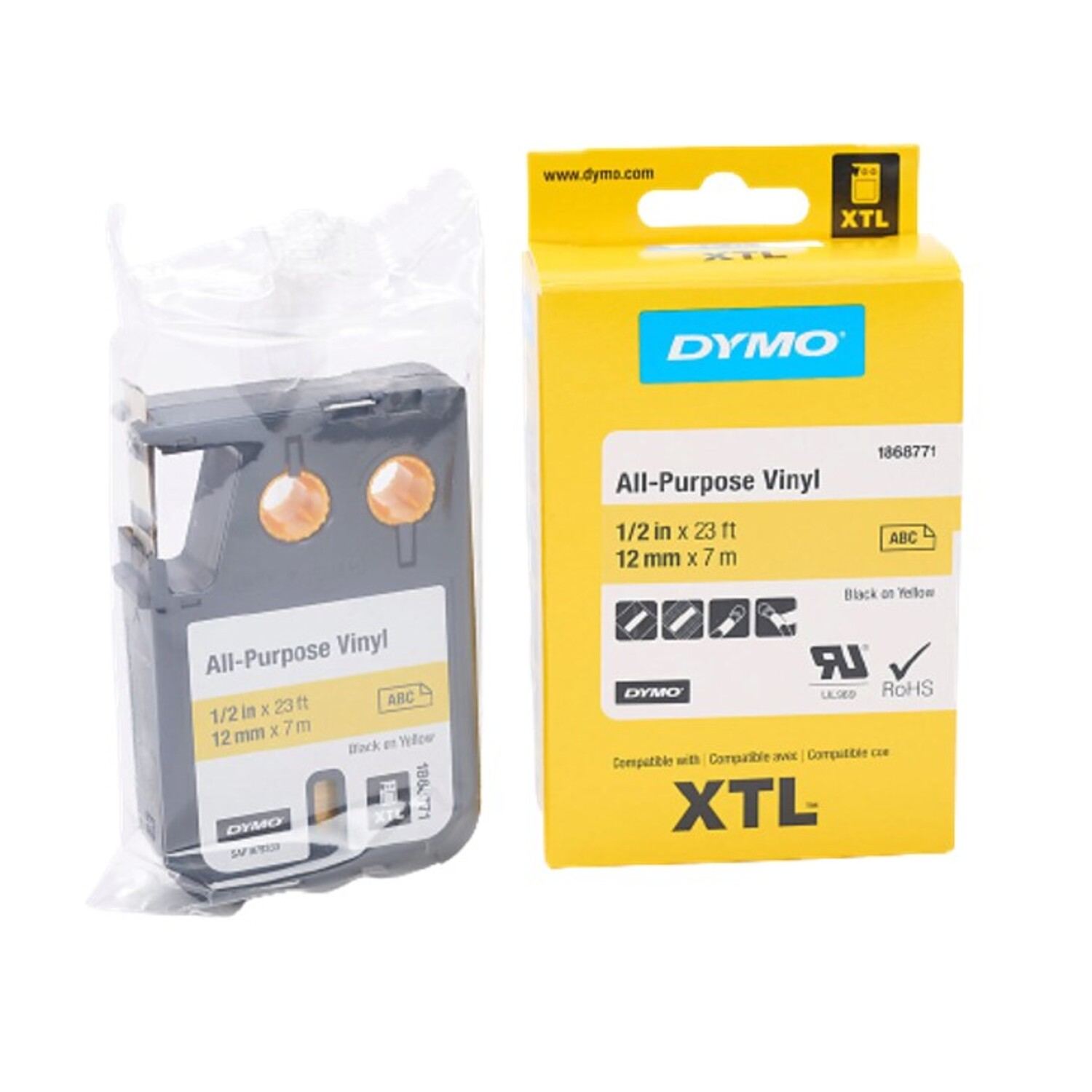 Cinta Dymo XTL en vinilo para imprimir en color negro sobre amarillo de 12mm de ancho x 7 mts de largo recubierta con adhesivo de grado industrial.