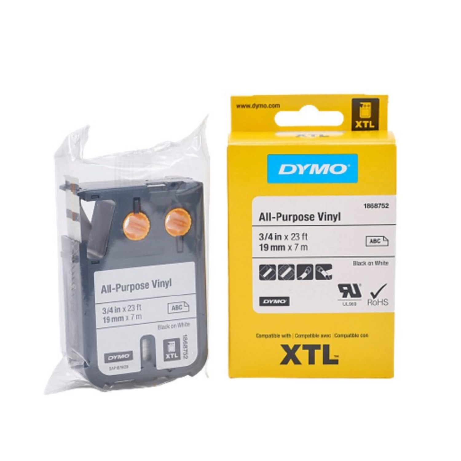 Cinta Dymo XTL en vinilo color negro sobre blanco de 19mm de ancho x 7 mts de largo recubierta con adhesivo de grado industrial.
