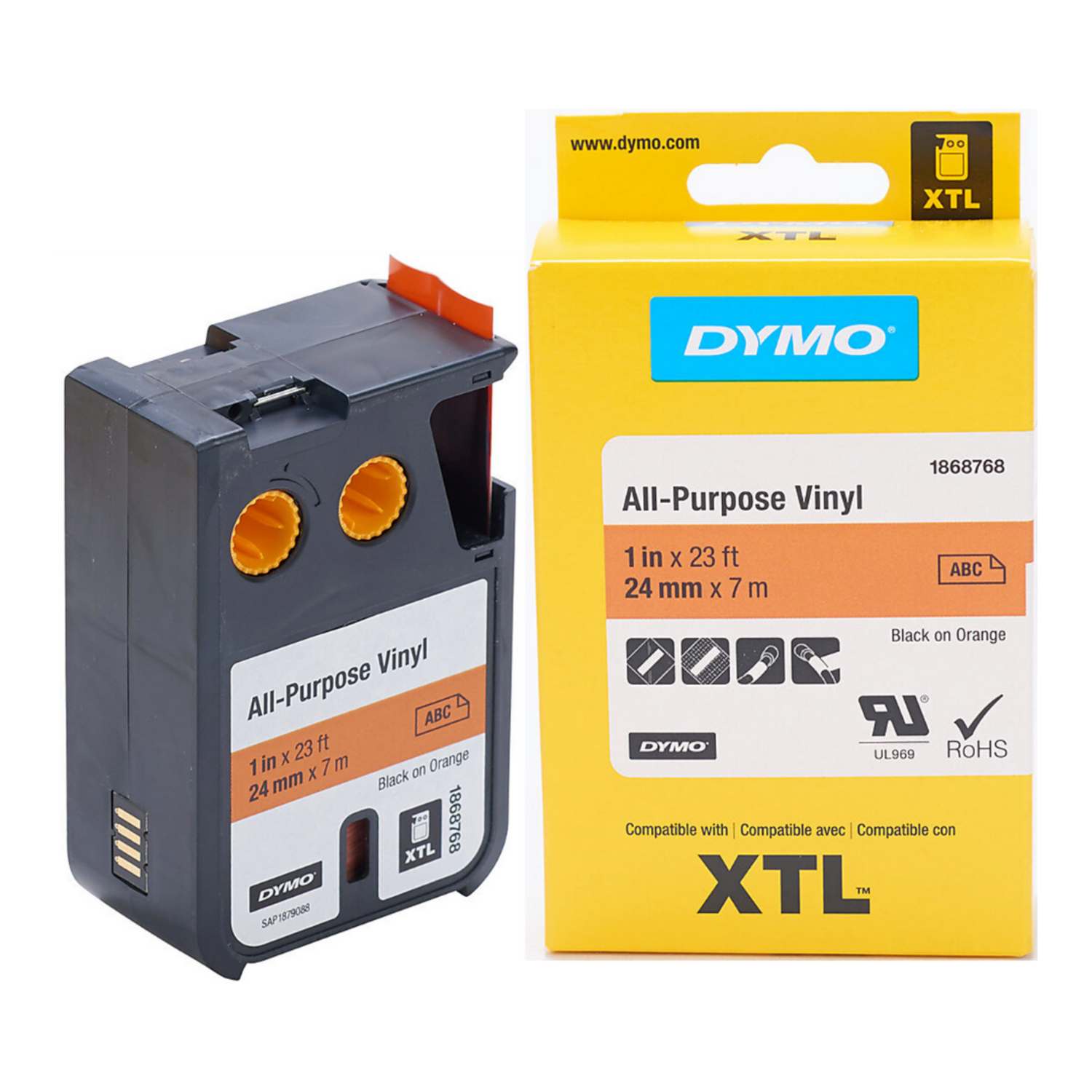 Cinta Dymo XTL en vinilo color negro sobre metalizado de 24 mm de ancho x 7 mts de largo recubierta con adhesivo de grado industrial.
