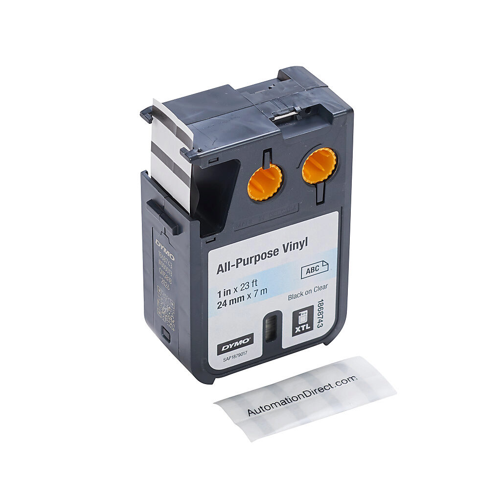 Cinta Dymo XTL en vinilo color negro sobre transparente de 24 mm de ancho x 7 mts de largo recubierta con adhesivo de grado industrial.