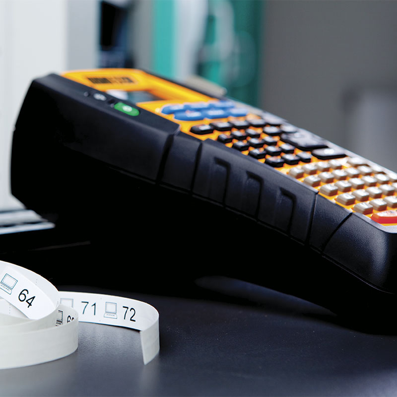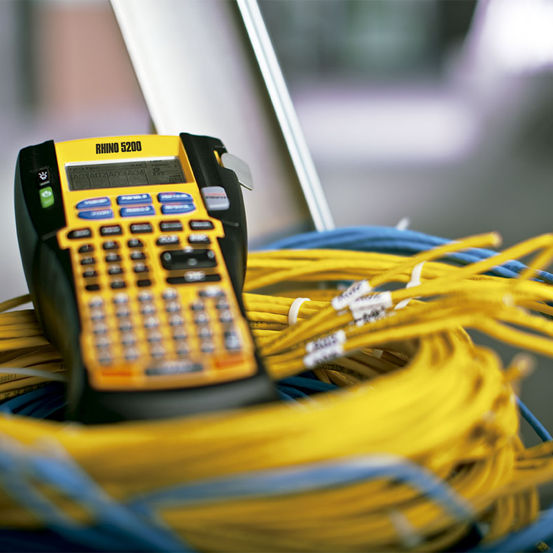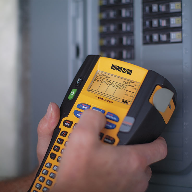 Kit rotuladora Industrial Rhino 5200 para marcación de cableado estructurado que imprime sobre material vinilo, poliester, nailon y termoencogible en cintas de 6mm a 19 mm de ancho. Incluye cargador, baterio de litio, 1 cartucho de vinilo y un maletín de transporte