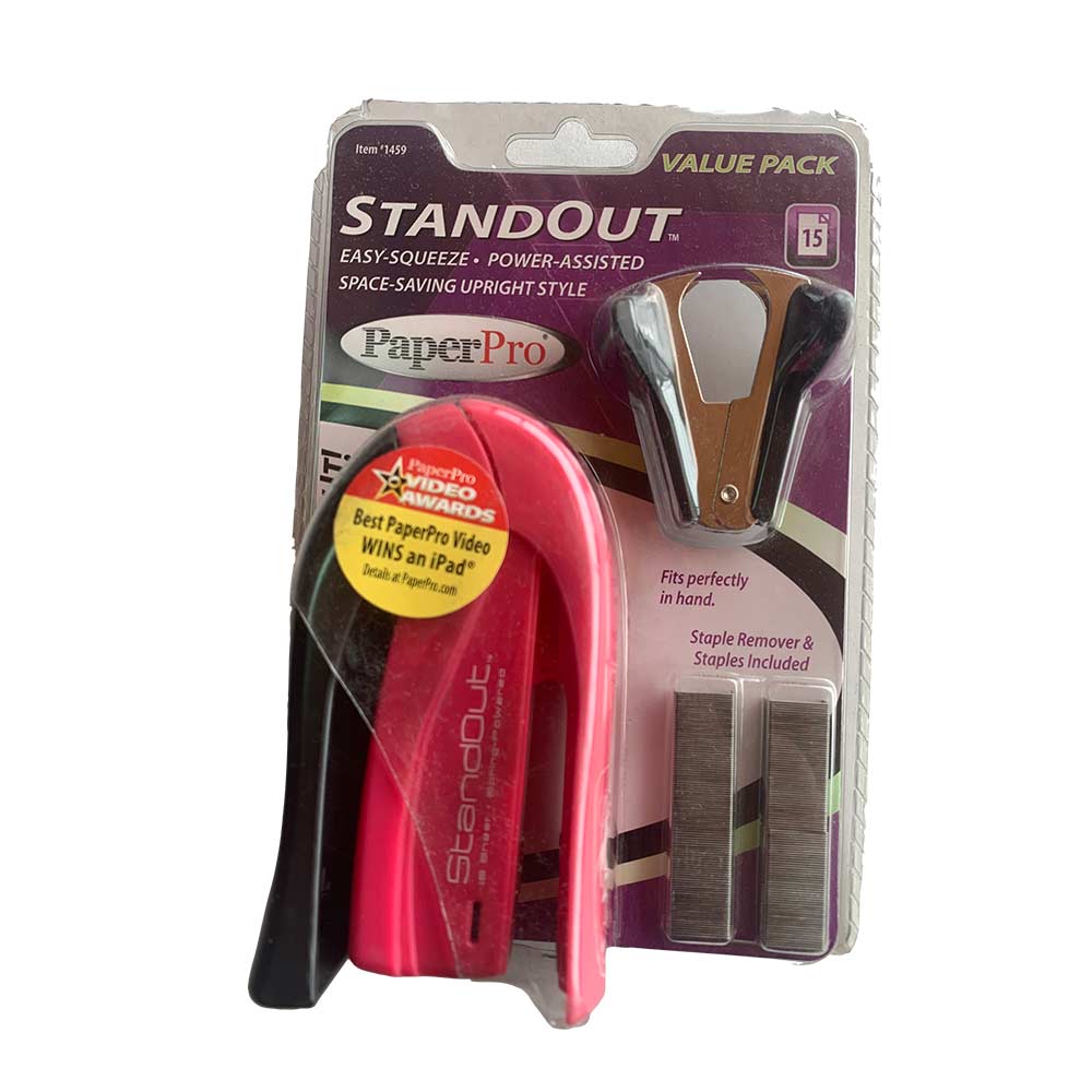 Tecnología de grapado sencillo accionado por resorte One-finger. Grapa hasta 15 hojas sin atascos para un funcionamiento continuo y sin problemas, diseño fácil de apretar para un uso manual cómodo, compacto y ligero. Utiliza grapas estándar.